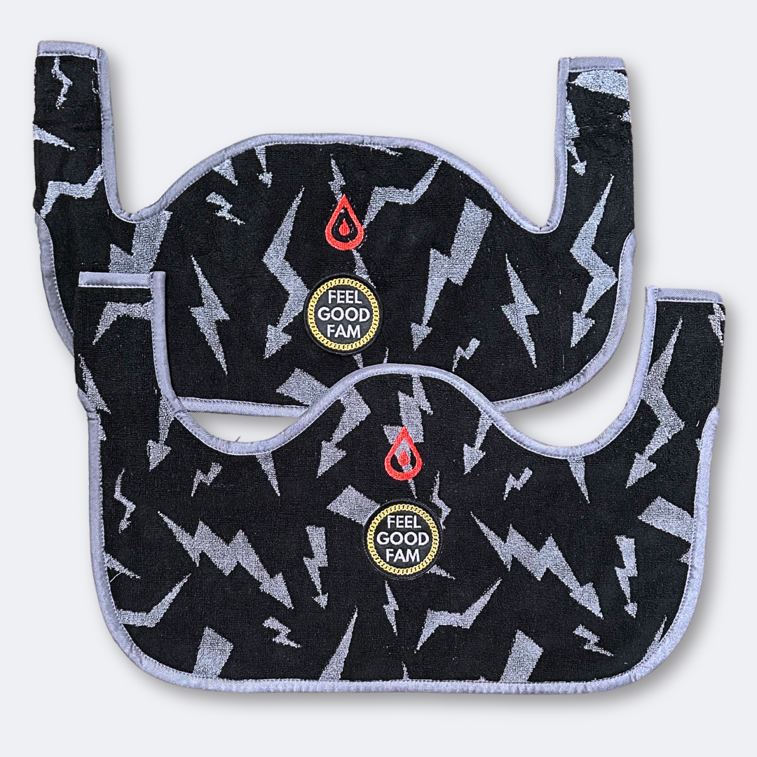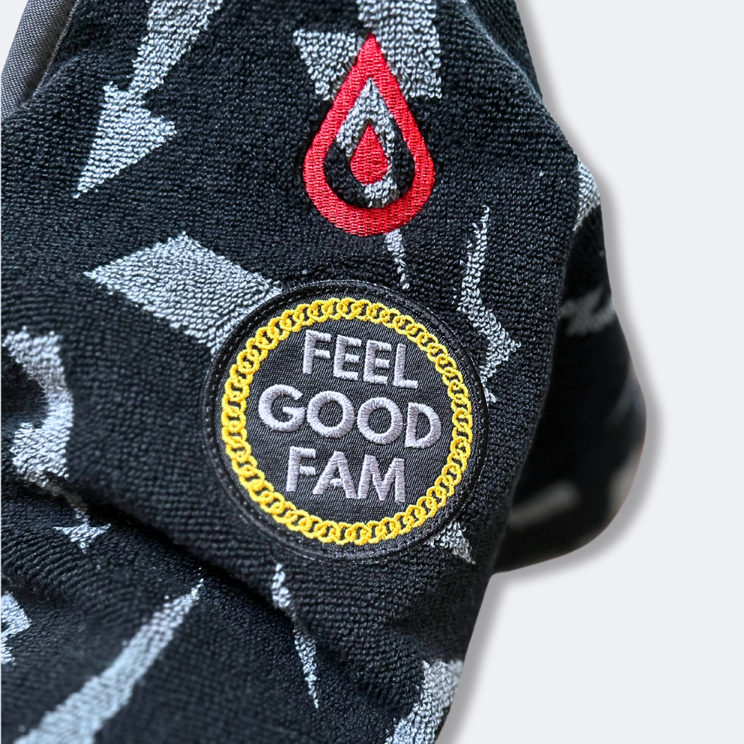 The Feel Good Fam is all about uplifting your spirits, and when you're in a positive mindset, you tend to perform better! Next time you hop on your bike, bring along your Feel Good Family spintowel to soak up all those good vibes. This two-piece Terry bolt set features a gorgeous embroidered patch representing the Feel Good Fam, complete with a shimmering gold metallic signature chain that honors the group's beloved instructor.